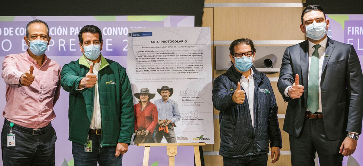 Bogotá, 10 de febrero de 2022 (@MinAgricultura - @ECOPETROL_SA) – El Ministerio de Agricultura y Desarrollo Rural y Ecopetrol firmaron un acuerdo de cooperación con el propósito de darle continuidad al programa "El Campo Emprende”, que para la convocatoria de 2022 contará con $29 mil millones de pesos. La iniciativa, busca apoyar los emprendimientos de la población rural, mejorando sus condiciones de vida, empleo e ingresos de las familias campesinas.