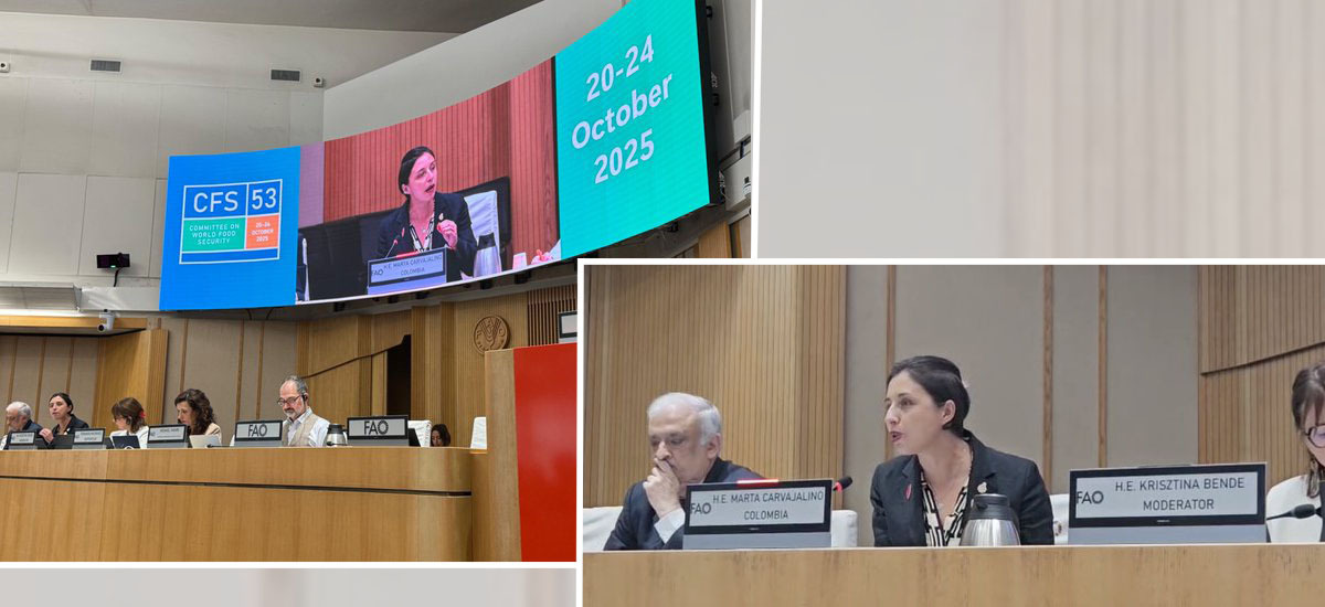 Roma (Italia), 20 de octubre de 2025 (@MinAgricultura). – En el Comité Mundial de Seguridad Alimentaria, realizado en Roma (Italia), la ministra de Agricultura y Desarrollo Rural, Martha Carvajalino, habló de Reforma Agraria, de transición de cultivos ilícitos, de la histórica baja en la inflación, la protección al campesinado, la lucha contra el hambre y de las acciones contra la crisis climática y la construcción de paz, entre otros temas.